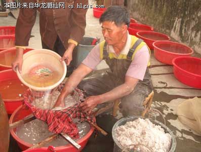湘桥区桥东街道卧石村有种莲藕的传统, 莲藕粉是该村的特色产业。将莲藕磨粉,需用打浆机将莲藕粉碎,再经过洗浆、漂浆、取粉、晒干等程序。据介绍,1亩地莲藕可磨成300多斤粉,每斤粉可卖30元。图为卧石村村民丁实添在将已粉碎的莲藕进行洗浆。