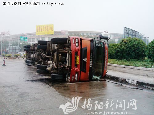 昨天上午,记者途经省道236线普宁洪阳大圆时看到惊险一幕,一辆悬挂“闽E”牌照满载货物的大货车侧翻在路面上,车头已严重破损。据现场群众介绍,大货车可能是在绕圆行驶时撞上了绿化护栏,致使车辆重心失稳侧翻在地。幸好当时货车左侧没有车辆,要不然后果不堪设想。