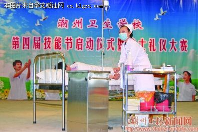 日前,潮州卫校举行第四届技能节开幕式暨“塑天使形象,展护士风采”护士礼仪大赛。据悉,本届技能节持续两个半月时间,共有13个专业26个班级共1500多名学生参加12个项目的技能竞赛。图为该校护理专业学生在进行技能展示,该项目将代表潮州市参加4月份举行的全省中职教育护理技能大赛。 潮卫 摄