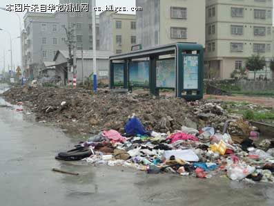 路旁一公交候车亭遭大量的废土和垃圾“围困”。附近市民告诉记者,前段时间,他们曾看到数辆运泥车将废土倾倒在这里。