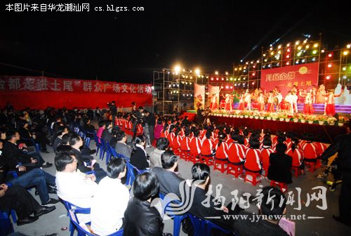 当晚7点30分,地都镇土尾村流光溢彩,人潮涌动。“月起金都·走进土尾”群众广场文化活动在潮州大锣鼓《龙腾鼓舞》拉开了帷幕,铿锵的锣鼓声传递出农民兄弟欢欣鼓舞地回望收获、展望未来的强烈心声。紧接着,歌曲、相声、舞蹈、潮剧等精彩节目轮番上阵。旋律优美、朗朗上口的主题曲《月起金都颂和谐》,让现场观众心潮澎湃,把晚会推向了高潮。幽默滑稽的三句半《欢喜在》,展现了社会主义新农村建设的巨大成就,歌颂了新农村的良好风貌,表达了村民对美好生活的憧憬和祝福。整台晚会高潮迭起,精彩纷呈,掌声连连。