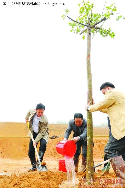 昨天上午,潮州市委副书记、市长李庆雄等在潮安县铁铺镇坎下村参加义务植树时,为树苗培土。