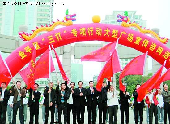 昨天上午,金平区在人民广场举行“三打两建”专项行动大型宣传咨询和主题文艺演出活动。市委常委、市政法委书记谢泽生察看了活动现场,并为该区17个街道的“三打”行动队授旗。除主题文艺表演外,还组织了区打击欺行霸市、打击制假售假、打击商业贿赂三个专项行动小组开展政策法规咨询,设立“三打”专项行动主题灯谜台,并开展扶贫济困、公益福利彩票和文明志愿者活动。