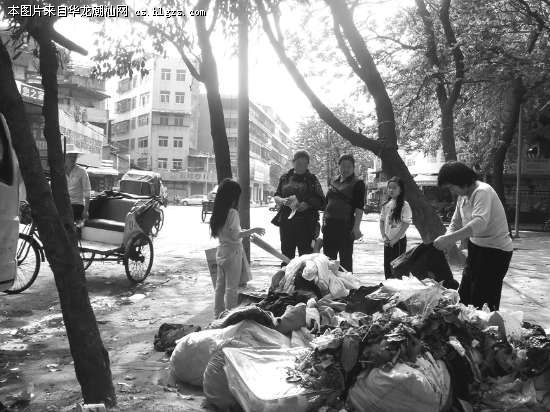 ▲回收废品的人员在路边挑拣垃圾里的旧衣服。