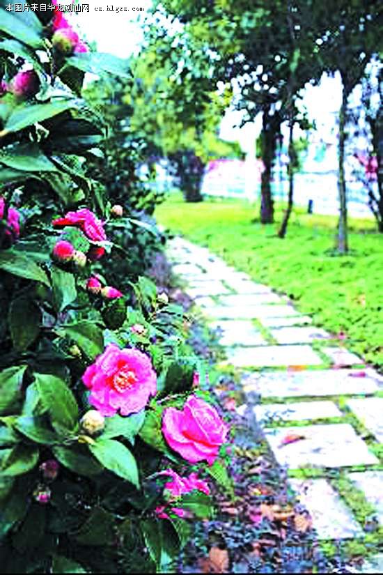 单车道旁边是一片花海,茶花、杜娟、龙船花……拥簇着中间的石板路,分外妖娆。最令人惊喜的是茶树上点缀着的一抹抹粉红,仔细一数,每棵茶树上挂着上百朵茶花,有的美丽绽放绚丽夺目,散发出淡淡清香;有的含苞待放,安静伫立枝头。