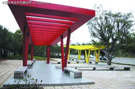 走乏了,骑累了,锦泰花园对面便是一处休息长廊,大家可以在此歇歇脚。这里建造了两个分别为红色和黄色的钢质雕塑,造型独特鲜艳大气而动感十足,相当夺目。雕塑下建有石椅,可供市民在此休憩闲坐、喝水聊天。