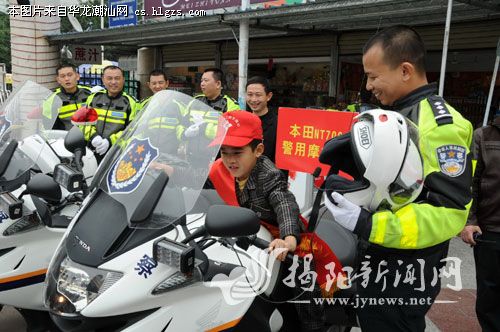 “小不点”磨着警察叔叔,终于过上了一回摩托瘾。