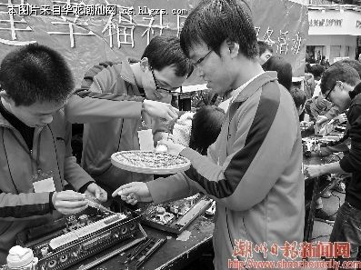 前天上午10点左右,记者来到开元广场时看到,志愿服务点前已堆满电热壶、电蚊拍、收音机等社区居民送来维修的家用电器,而40多名志愿者则当起了“小医生”,认真地为损坏的家电“诊断治疗”:拆卸、检测、焊接、换小零件……不一会儿功夫,许多家电便已“健康痊愈”,编好序列号等待着居民来认领。而在一旁的医疗服务点,志愿者现场为社区居民免费提供测量血压、分发健康饮食传单、宣传健康保健知识等便民服务。