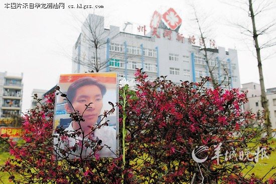 陈焕的照片被家人摆放在事发医院门口的花丛中