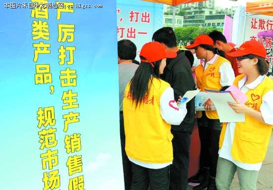 ▲市打击制假售假专项行动小组工作人员现场发放有关资料,并接受群众报料。