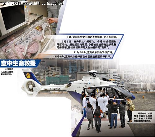 这是一场在空中展开的生命救援——汕头5个月大的女婴小芬患有严重先天性心脏病急需转到广州接受手术,病情无法经得住6个多小时的长途舟车奔波。在死神逼近之前,航空医疗急救启动,直升机将小芬直接从汕头接到广州,只需1个多小时飞行。昨日中午1时许,小芬顺利抵达广东省人民医院,并在第一时间被送入儿童危重症监护室救治。