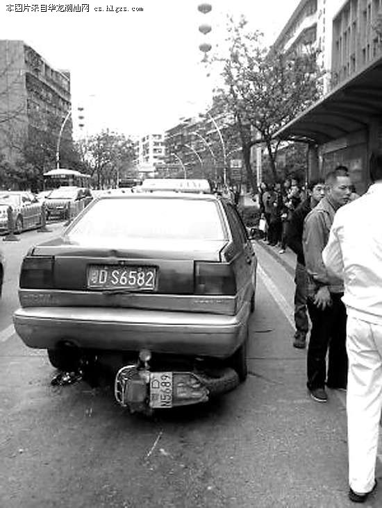 昨天上午,市区金砂西路发生一起交通事故,一辆男庄摩托车不慎被卷进了一辆粤D牌的士车底,事故中摩托车驾驶员受伤,所幸伤势不重。