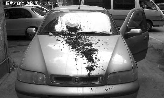 瞧瞧汽车惨遭“毁容”的场面,确实也让人感到恶心——汽车的前挡风玻璃和车头上,溅满了斑斑点点的污水,散开的茶叶渣、烟盒、烟头、生活污物等沿着车头的坡度一路蜿蜒而下,一个白得刺眼、尚留着残羹剩菜的饭盒还紧贴在挡风玻璃上不肯下来,似乎是在炫耀它刚刚找到一个新窝。