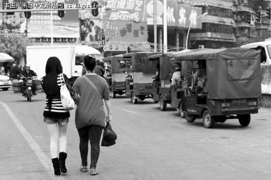 同样非法营运的现象也出现在汽车总站周边。记者看到,虽然该处蓝牌车的数量较少,但取而代之的是一辆辆违规经营的后三轮车。在汽车总站与解放桥中间,近十辆后三轮车停放在狭窄的路面上,司机们互相聊天,并未理会身旁拥挤的交通路况。由于汽车总站旁边又是服装批发市场,进出车辆络绎不绝,附近交通情况十分混乱。
