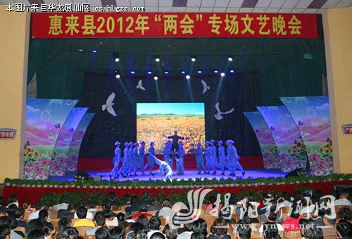 日前,惠来县葵阳影剧院歌声飞扬、舞步翩跹、掌声此起彼伏,由该县宣传部、人大办和政协办主办的“春天的祝福—惠来县2012年‘两会’专场文艺晚会”在这里精彩上演,演员们用美妙的歌声、优雅的舞姿和生动的语言,为与会的代表、委员和群众呈上了精美的“文化大餐”,表达了对该县“两会”成功举行的祝贺,对打造海港经济区,建设滨海新城、幸福惠来的祝福与美好的憧憬。