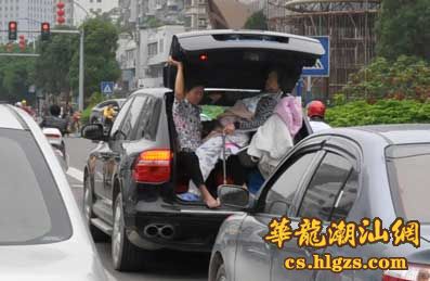 日前,一辆后尾厢门板高高翘起的小车穿梭在潮枫路的车流中,里面载着两名妇女。记者见到,年长妇女坐在厢中临时放置的垫有被子的靠椅上,头部几乎顶着翘起的门板,像一名刚出院的病人,中年妇女手撑着门板边缘挤坐一旁照顾。如此违规冒险载人,若路上病人被翻动门板砸伤或被抛出厢外,后果不堪设想。