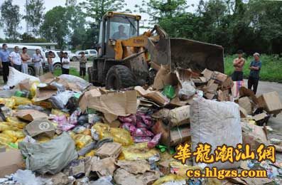 在潮安县沙溪镇一垃圾处理场,记者看到,被现场销毁的涉假物资堆积如山,包括食品、药品、皮具、烟酒、陶瓷用品等,这些都是近段时间潮安县各职能部门在“三打”专项行动中查获的。随着招挥员的一声令下,工作人员将一箱箱涉假物资拆封查验,然后用铲车来回碾压粉碎,再运到火炉中进行高温焚烧。不一会儿,大批涉假物资便化为乌有。