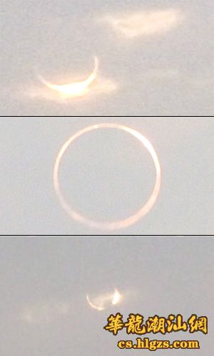 据了解,揭阳市日出时间为5时30分。昨天清晨,当记者5时45分驱车前往市区揭阳楼时,太阳仍被大片乌云遮挡住。然而天公作美,6时05分左右,犹如弯月般的太阳在两片乌云的狭缝中探出了头;6时08分,食甚开始,太阳被遮住后,只剩下一个“金指环”悬挂于天边,持续时间为4分钟左右;6时13分,太阳又钻回了厚厚的云层中。