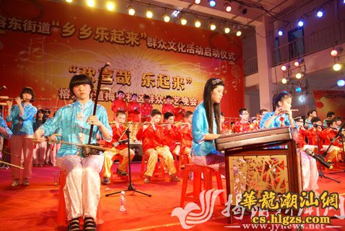 当晚8时,榕东街道“乡乡乐起来”群众性文化活动正式启动。在热烈的掌声中,由梅兜少年鼓乐队表演的《潮州大锣鼓》拉开“欢乐哉 乐起来” 群众文艺晚会的帷幕,78岁高龄的秀明老伯登台演唱了富有乡土特色的潮曲《十五贯》,其精彩的表演博得现场观众阵阵掌声。少儿模特秀《城市宝贝》、歌曲串烧《创鸿飞歌》、街舞《舞动青春》等精彩的表演把现场气氛推向高潮,晚会在群舞《欢天喜地》中落下帷幕。