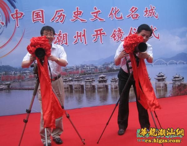 在现场热烈的掌声和现场礼花绽放中,中共潮州市委副书记、市长李庆雄,中国日报社副总编康兵,一起走向主席台上摆放的两部单反相机前,俯身注视着相机的取景镜,调节着焦距,按下相机按钮,为《聚焦中国历史文化名城—潮州》拍摄下第一组镜头。