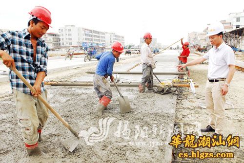 “哗啦啦……”的声音响起,又一车混凝土倾倒进路模里,早就等候在一旁的建筑工人快步上前,铁铲、震动桥、震动平板等轮番上阵,经过一系列紧张熟练的操作,又一段路的混凝土层成形了。这是日前记者来到市区进贤门大道东段施工现场时见到的一幕。在这里,1000多名建设者正以饱满的热情加班加点推进工程建设,用他们辛勤的汗水准备着为揭阳市建市20周岁献礼。随后,记者走进市区进贤门大道东及环市东路市政道路工程项目部,探访这些日夜奋战在工程第一线的建设者。