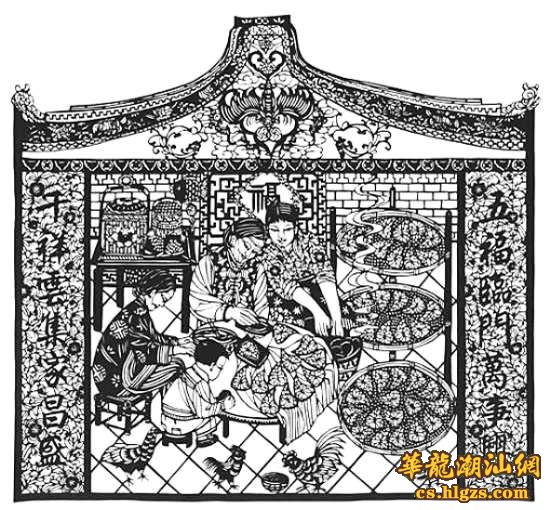 黄少琼的剪纸作品《做桃@》用俯视角度表现祖孙四代人的形象及景物设置,画面上的四个人物围坐在圆桌旁,桌面放着已做好的桃@、@印和一大盆@馅;坐在圆桌左侧竹椅上的老奶奶在用@皮包馅,中间依偎的婆媳一人在木印模上装@,一人在用双手揉@皮,小男孩则是手拿@皮在学包馅。