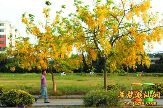 傍晚,猛烈的阳光逐渐柔弱了下来,不少市民在时代广场闲庭信步、跑步锻炼。通道里广泛种植的行道树——腊肠树,眼下正是花开得绚烂的时季,整个广场笼罩在一片黄色花海中。
