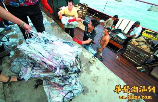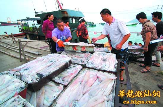 早晨6点20分,南澳的海面还沐浴在晨曦里,码头上已是熙熙攘攘的人群。一艘渔船刚靠岸,渔民们从船舱里提出一箱箱新鲜的鱿鱼,等在码头上的鱿贩们看着便喜逐颜开——这鱿鱼新鲜,长相又好,准能卖个好价钱!