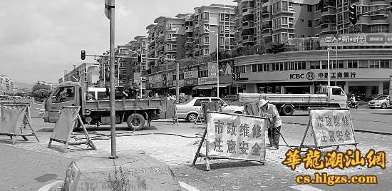 近日,记者来到该路口,施工路面已经被围了起来,工人正在清除路面的旧沥青,道路的修补给路口车辆的通行带来一定的影响。据市政管理处的王科长介绍,整个修补的路面面积约六七百平方米,预计本月上旬可恢复正常通行。 本报记者 黄鸿华 摄