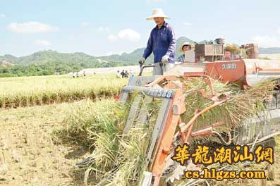 我市早稻开始收割。昨天上午,湘桥区意溪镇小陂村的农民雇请来自安徽的农机师傅,驾驶联合收割机抢收早稻。据了解,由于今年该村百多亩稻田前段时间接连遭受两次水浸,产量大减,估计亩产只有500多斤,与去年亩产1000多斤相比,已减产一半左右。 本报记者 陈宏文 摄