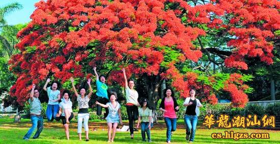 在汕头大学校园,行政楼前一树金凤花开得正艳,与绿草地相互映衬。火红金凤树下,汕大长江新闻与传播学院今年的毕业生欢快跃起,他们即将步上到社会大舞台,开始人生新历练,直至枝繁叶茂,一如母校的金凤树。 马卡 摄