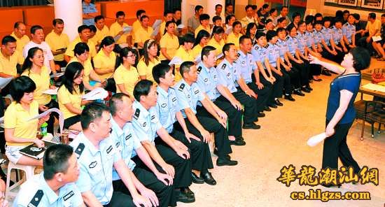 汕头市车管所干警合唱队近日在交警系统的拉歌比赛中获得第一名,为了丰富警营文化,昨晚合唱队在交警支队陈小红政委和车管所李所长的带领下,兴致勃勃地来到汕头市合唱团交流学习,警民同唱一首歌,现场还开展便民服务和交通安全宣传。 本报记者 张烈华 摄