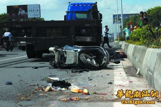 本报讯(记者 杨立轩 摄影报道) 昨日下午1时多,市区潮汕路寨头社区路口处发生一起致命交通事故。一名摩托车女骑士连车带人被一辆空载集装箱车卷进车底,女骑士当场死亡,身体被严重撕裂。
