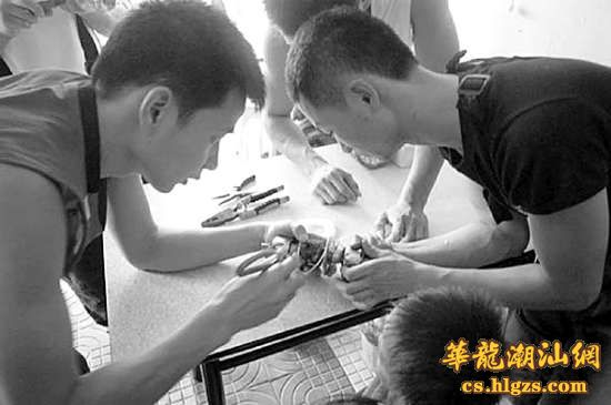 当天上午10时54分,澄海消防中队接到消防指挥中心命令:广益华富村雄业厂对面的沙县小吃店内有一小孩手指被夹,情况危急。消防官兵马上出警赶到现场,看到一名小男孩的手指被夹在房间的门锁缝里,因长时间挤压已经肿胀无法动弹,小男孩哭声不断,家长心急如焚。消防官兵一边稳住小男孩的情绪,一边利用锯子破拆木门,分离门锁与木门。随后,指挥员仔细对门锁的结构进行查看,利用锯子、镙丝刀等工具拆解门锁。