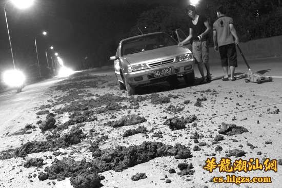 前晚9点多,市民林先生外出办事后准备回家,开车从泰山路自南往北方向行驶。由于当时路上车辆少,林先生的车速一直开得较快。然而,正当他行驶至龙腾熙园路段时,眼前的一幕却让他差点反应不过来。“机动车道上满布淤泥,几乎无路可走,还好我最终刹得住车。”侥幸逃过“一劫”后,林先生只好放慢车速从淤泥上行驶过去。“刚刚洗好的车,一下子喷满了泥浆,真郁闷!”据林先生介绍,他看到不止一辆私家车因来不及刹车,不幸“压”中石块而前轮爆胎。