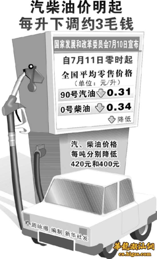 据新华社北京7月10日电 国家发改委决定自7月11日零时起将汽、柴油价格每吨分别降低420元和400元,测算到零售价格90号汽油和0号柴油(全国平均)每升分别降低0.31元和0.34元。