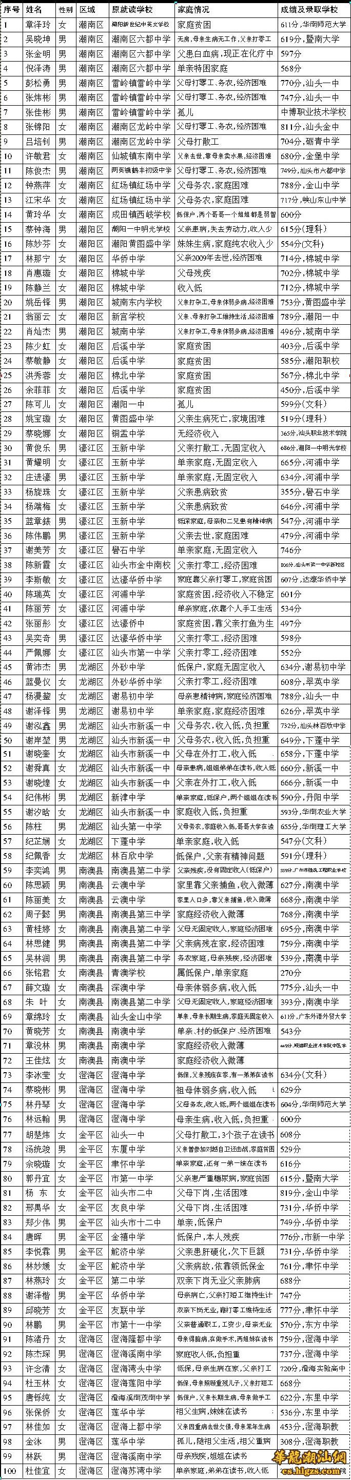 汕头都市报讯(记者 林彦恂 实习生 林瑶瑶) 在我们身边,有这么一群出身寒门的孩子,他们学习成绩优异,却因家庭经济困难而陷入难以继续升学的困境。为让更多孩子圆读书梦,市妇联与汕头都市报联合开展“盛夏浓情 爱心助学”活动,推出100名等待资助的今年参加中、高考的优秀贫困生相关情况,希望热心人士踊跃响应奉献爱心,一起帮助孩子们完成上学的心愿。
