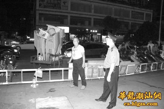 昨晚7时许,记者来到人民广场,只见执法人员和管理人员守在入口处,防止经营者将桌椅搬入广场内,经营者则站在门口仍然观望不肯离去。