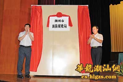 本报讯(记者 庞磊成) 在省纪委、省监察厅和市委、市政府的高度重视和支持下,潮州市预防腐败局昨天上午正式揭牌成立,这对于推进我市反腐倡廉建设具有十分重要的意义。省委常委、省纪委书记黄先耀和市委书记、市人大常委会主任许光为潮州市预防腐败局揭牌。