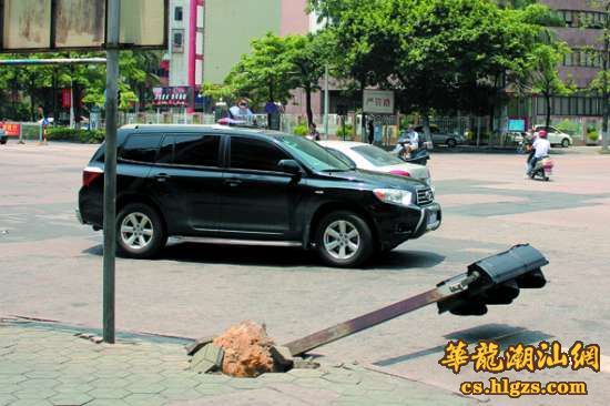记者在现场看到,这盏行人信号灯位于金砂金新路口东南方向,灯底连“根”拔起,灯身倾倒在地,对金新路右拐至金砂东路的车辆造成一定影响。由于信号灯损坏,行人无法看到红绿灯转换,不少市民只能穿梭于车流中通过路口。据附近一保安介绍,信号灯倾倒是受车辆撞击所致。