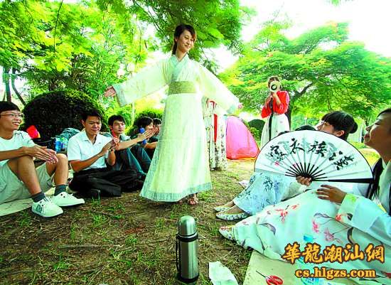 19日,汕头汉服社组织一群社员身穿汉服在金砂公园迎七夕过乞巧。在活动现场,身穿汉服的社员们朗诵完成人礼文后,先后进行了女子斗巧:厨艺,缝纫,剪纸、折纸、绘画,红娘牵线,莲藕穿针等传统游戏,体验汉族传统文化,迎接七夕乞巧节。