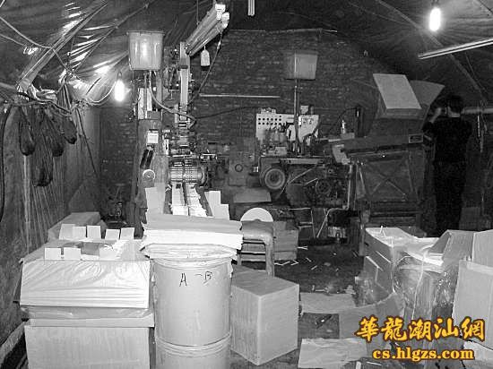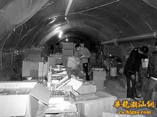 只见洞口不大,架着一只竹梯,一次只能容纳一个人慢慢爬下去。当巡查人员沿着竹梯爬进洞时,看到洞里凌乱摆放着1套(2台)卷烟机械、1台(套)卷烟包装机、柴油发动机组2台以及滤嘴棒、烟丝、水松纸、卷烟纸、内衬纸、商标标识纸等一批,涉嫌假冒“双喜”牌香烟(软经典)一批,现场不见人影。