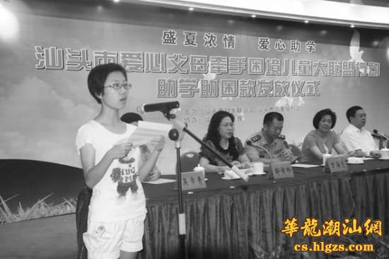 本报讯(记者 郭丹 曾春乐 摄影报道)最近,由市妇联与汕头都市报联合开展的“盛夏浓情 爱心助学”活动,得到众多市民和爱心单位的大力支持,共筹款18.3万元,帮助103名优秀贫困生圆了读书梦。昨天上午,由市妇联、市儿童福利会主办,汕头都市报协办的汕头市爱心父母牵手困境儿童大联盟行动助学助困款发放仪式在汕头迎宾馆举行。市委副书记孙光辉出席仪式并讲话。