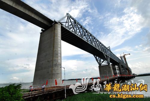 厦深铁路榕江特大桥动工以来,各项建设工作进展顺利,大桥墩身有望在今年9月中旬全部完成,水中主桥钢桁拱架设有望在9月底完成。图为建设中的厦深铁路榕江特大桥已初展雄姿。 卢泽鸿 摄