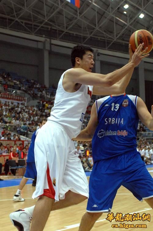 中国队球员王治郅(左)在比赛中与对方球员争夺篮板球。当日,2008年斯坦科维奇杯洲际篮球赛在杭州开赛,中国队在首场比赛中以96比72战胜塞尔维亚队。 新华社记者徐昱摄