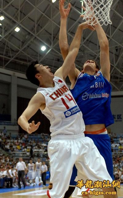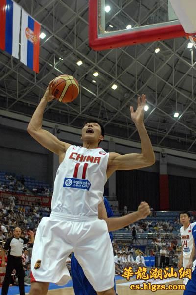 中国队球员朱芳雨(右)在比赛中上篮。当日,2008年斯坦科维奇杯洲际篮球赛在杭州开赛,中国队在首场比赛中以96比72战胜塞尔维亚队。 新华社记者徐昱摄