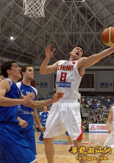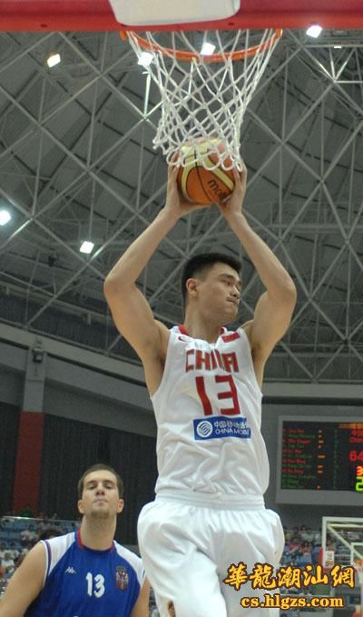 中国队球员姚明(右)在比赛中投篮。当日,2008年斯坦科维奇杯洲际篮球赛在杭州开赛,中国队在首场比赛中以96比72战胜塞尔维亚队。 新华社记者徐昱摄