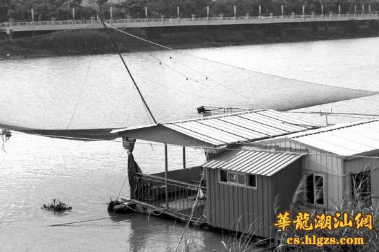 下午3时多,记者驱车沿着金津大桥北侧的河堤行驶,大约5分钟后,一栋搭建于新津河面的“高脚屋”出现在记者眼前。这座高脚屋面积约数十平方米,右侧设置有通往天台的楼梯。若站在楼梯的顶端,可自由操控河面上的电动渔网进行捕捞。记者看到,当时屋内聚集着五六人,有的站在高处捕鱼,有的跳进河中畅游,有的则闲坐在露台上喝茶。堤坝上,数辆中高级轿车一字排开,只留下一个车位的宽度供其他车辆通过。