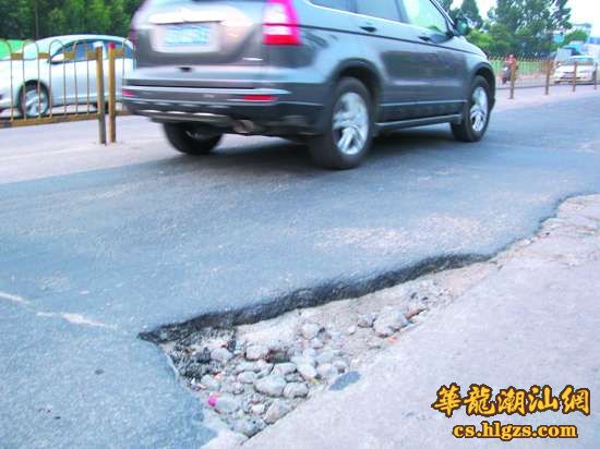 昨天下午,记者来到黄河路与华山路交叉处机动车道,看到路中央一个窨井盖下陷了0.2米左右。不远处,记者又发现一个路面严重破损形成的大坑,长有1米多,较深处约有20厘米,坑内掉落着水泥块及沙石杂物(如图)。不少车辆经过时均小心翼翼绕开,避让不及时,车辆“哐当”作响。