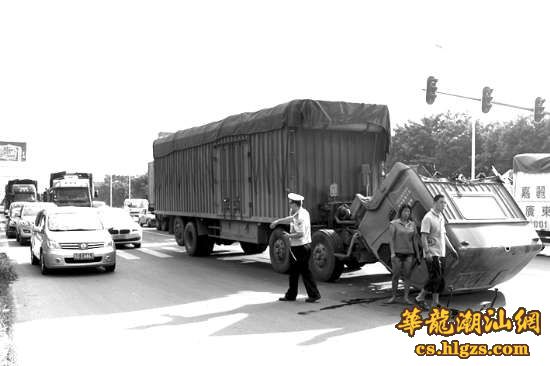 昨天下午近4时,记者赶赴现场,出事货车停在潮汕路与金平工业区交界路口,占据一条机动车道。货车驾驶室严重倾斜并倒卧在地,前挡风玻璃破碎,后视镜折断,车内物品散落一地。在货车一旁,一名女子脸部受伤,脖子和衣服布满血迹。据她介绍,事发时她正坐在副驾驶座上。